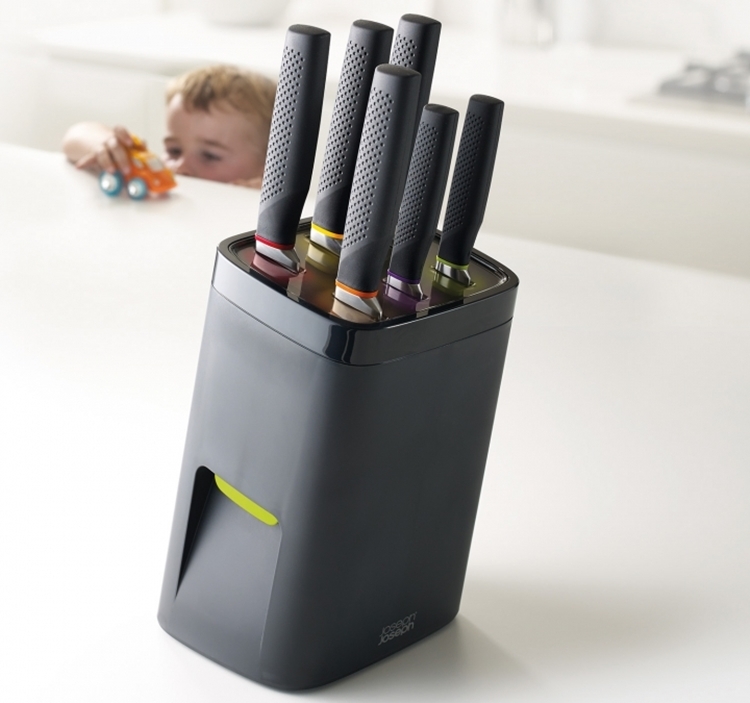 Made by Joseph Joseph, the self-locking feature is intended to prevent the knives from being easily grabbed by children, who could seriously hurt themselves when they treat the sharp blades as some kind of toy. Of course, you’re going to have to hope your kids don’t figure out that it releases with a push of the button, although the button has been intentionally rendered to be tougher to depress than usual, making it inoperable by the small hands of children five years old and under.