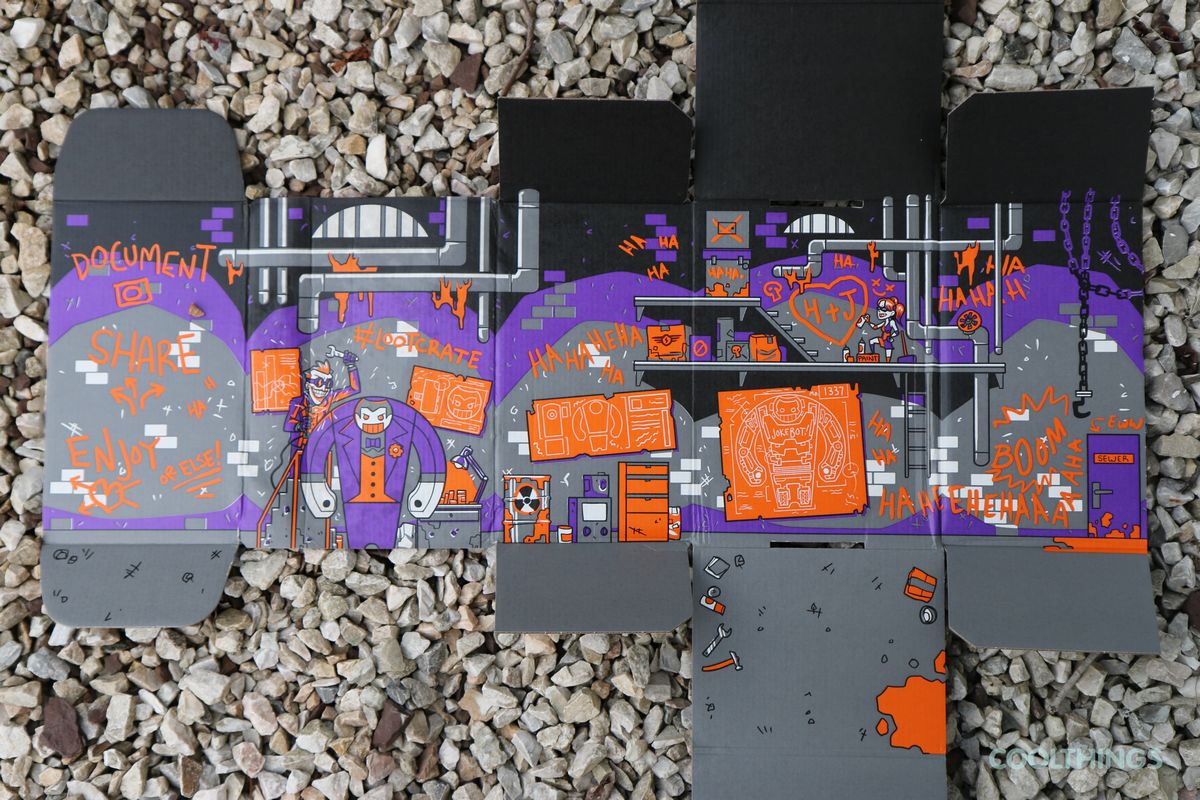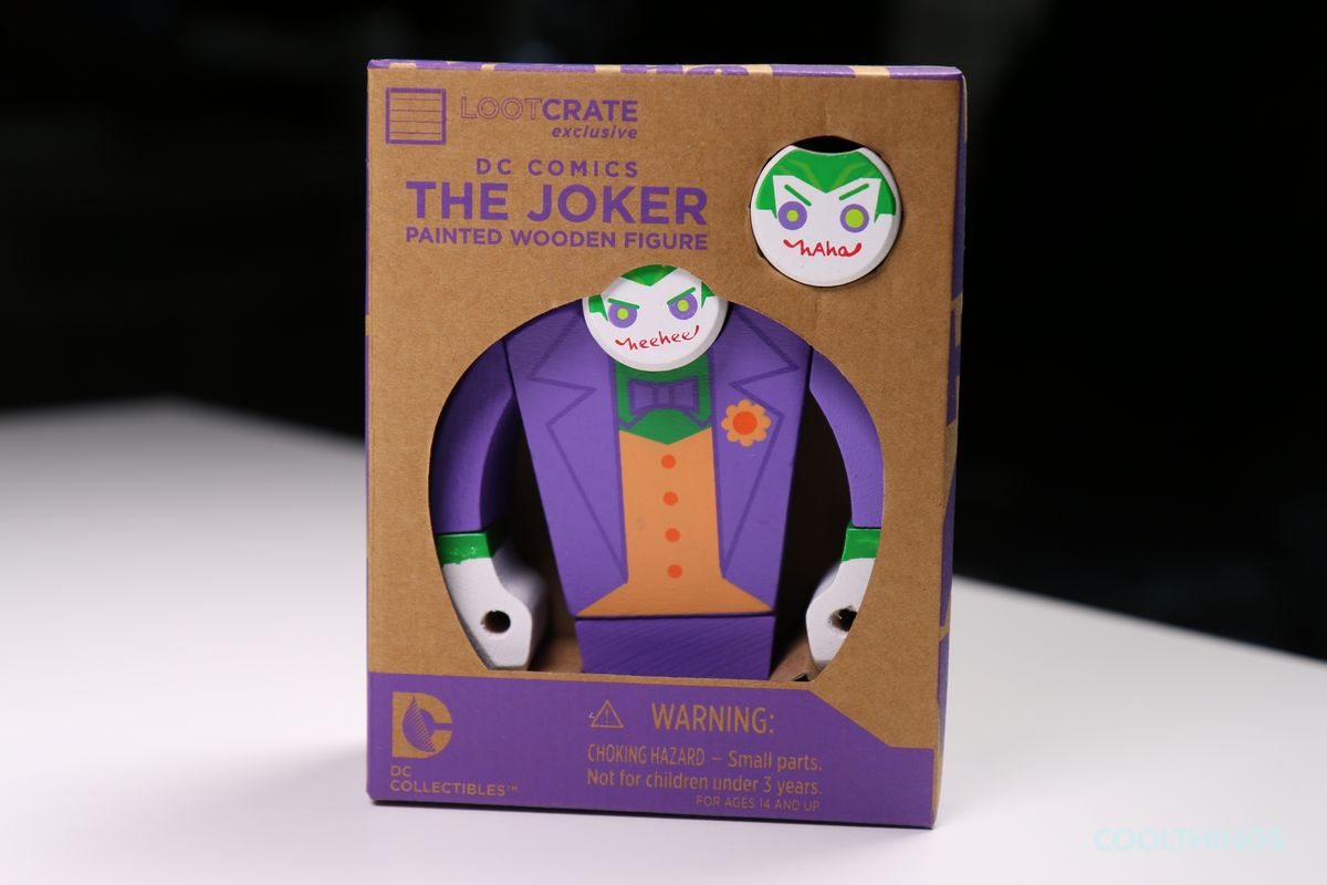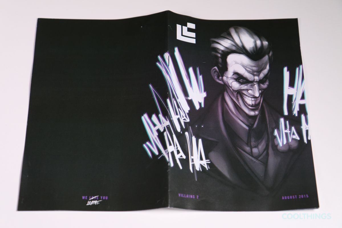 Next is a DC Collectibles Wooden Figure starring the Joker. This one’s, basically, like one of those old wooden toy figures, with exaggerated proportions that make the Clown Prince of Crime look like a hulking behemoth. It comes with two swappable heads and holes in its hands, so you can make it hold any equivalently-sized weapon (doesn’t come with any on the box, though). Just to complete the Joker love, the entire August 2015 Loot Crate box comes with inside art that looks like a depiction of Joker’s headquarters. Pretty cool.