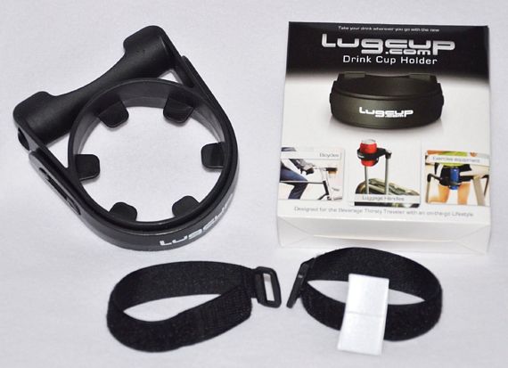 The Lugcup is a portable cup holder designed to hold coffee cups, soda bottles and travel mugs.  Construction is flexible thermoplastic rubber, so you can use it to hold drinking vessels with a 20 oz. capacity and smaller.  It uses a pair of 8-inch long straps to attach onto objects, which you secure using a Velcro closure.  Each one comes with a pair of double-sided foam tape which you can use for extra hold if it’s strapped to a slippery surface.