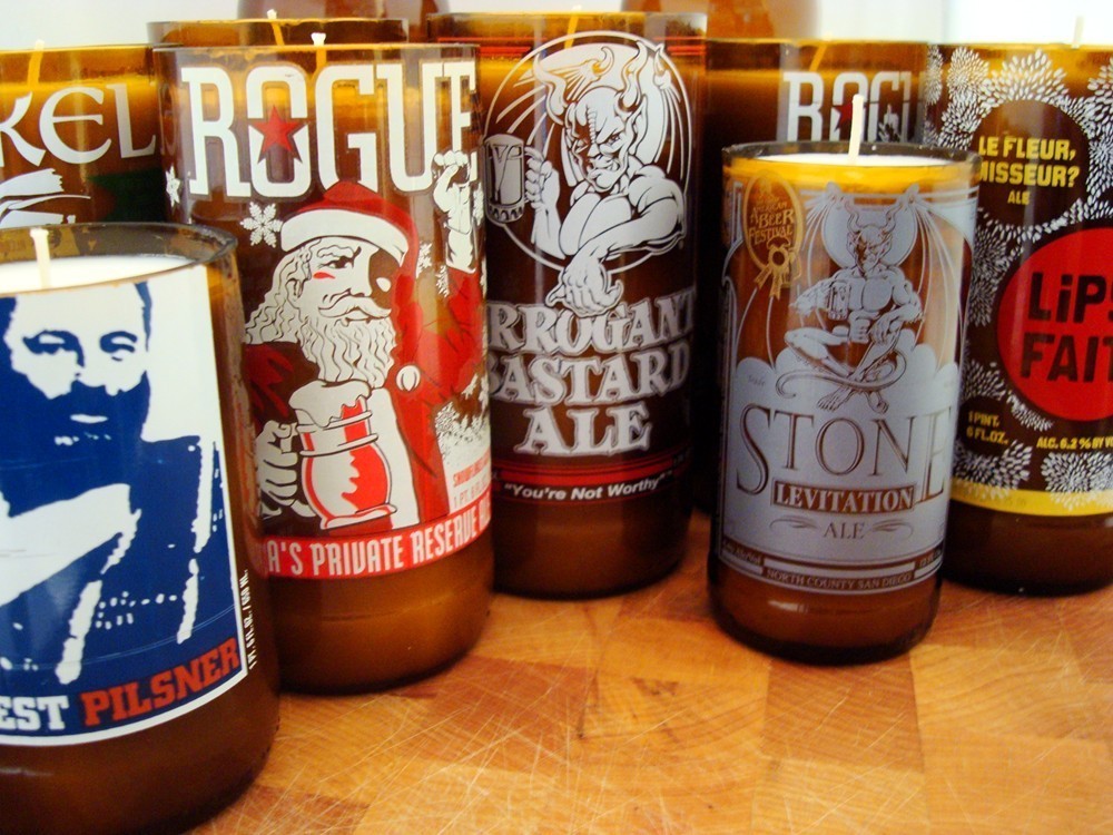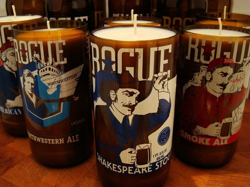 The bottles are sliced to about the height of a standard glass, with the rim sanded to a smooth finish. They seem to have access to a wide roster of Rogue Brewery’s bottles, from Smoked Ale to Brutal Bitter to Dead Guy Ale, and more. To make you feel better about buying candles, the creator wants you to know these things were “hand-crafted in a studio full of power tools and beer while Whitesnake plays in the background.” Manly.