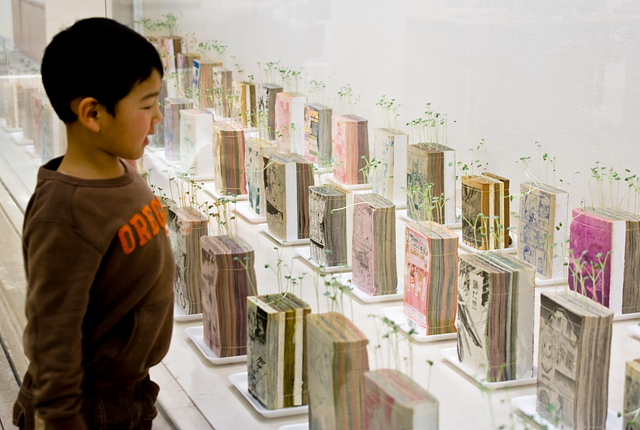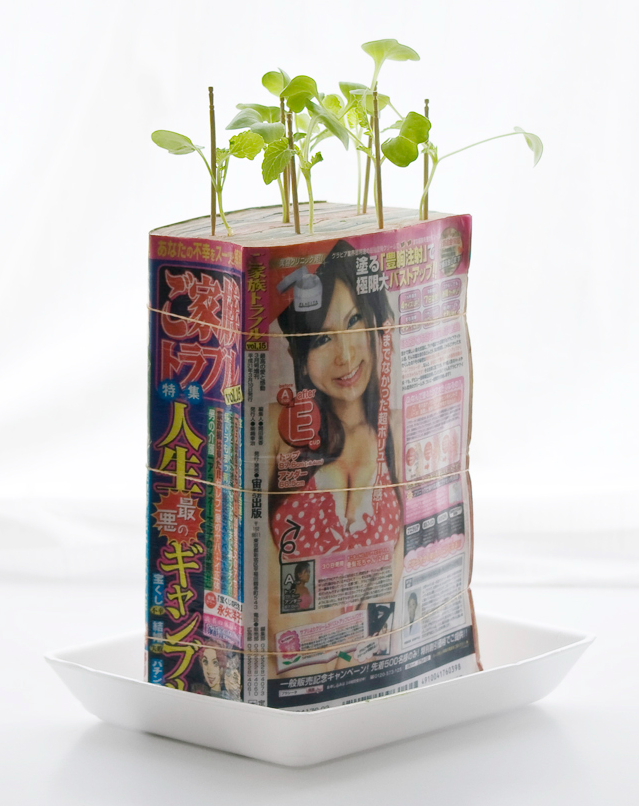 Manga Farming Makes A Garden Out Of Japanese Comic Books April 13, 2010 ART Did you know plants can grow on thick piles of paper (apparently, resourceful gardeners have been doing it forever)? I had no idea, so I was pleasantly surprised to see what Tokyo-based Koshi Kawachi did with his Manga Farming art project, which involves literally planting radish sprouts on a potted garden of old Japanese comic books. We're not sure how it's supposed to work, but he apparently uses old, wet paper as both the pot and soil to grow the fleshy root vegetable. He uses all sorts of manga books for the job too, from ones with panels that look like they're a bundle of laughs to ones with action sequences to ones with nothing but pictures of girls with chests bursting out of their blouses. The latter, by the way, should be my instant favorite. Koshi grows strictly radish sprouts for the exhibit, although I'm guessing it may be possible to grow other types of plants too. Why buy pots and sacks of soil for our home gardens when we could have been doing this all along? Even if you don't collect manga, similarly thick volumes should play the part too. If you don't have thick books (since, let's face it, reading hasn't been the cool kids' pastime since...ever), you should be able to descend on a garage sale, pick up the sacks of books everyone's trying to get rid of and you'll be all set. The Manga Farming art exhibit is currently being shown in an installation at the Matsuzakaya department store in Nagoya, Japan. Very, very cool. [Koshi Kawachi via Pink Tentacle] Leave a Reply Cancel Reply Your email address will not be published. Name* Email* Website Comment