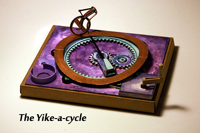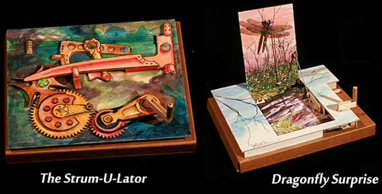 Five Mechanicards are set to be available as part of the introductory series, all of them made primarily from cardboard, with occasional bits of wood, metal and plastic. Current designs consist of The Radial Engine (a cross-section demonstration of the crankshaft arrangement found in seven-cylinder radial engines), The Ambigulator (which creates an optical effect when you operate it), The Strum-U-Lator (a hand-cranked stringed instrument), Dragonfly Surprise (a nature scene where a dragonfly emerges from a stream) and The Yike-a-cycle (a unicycle traversing a circular path).