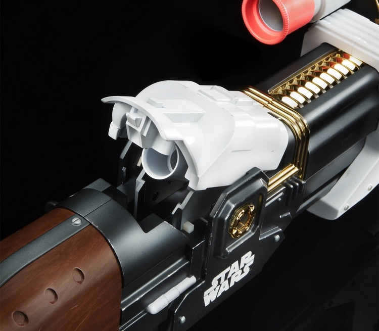 There’s a battery slot on the blaster that takes two AAA cells. Instead of being used to power the firing mechanism of the blaster, though, it’s used to light up the LED-illuminated scope and recreate a variety of rifle sounds the way they happen on the show. From having the rifle charge up after you load and prime to the distinctive sound of the rifle firing, this thing will sound exactly like the weapon in the series.