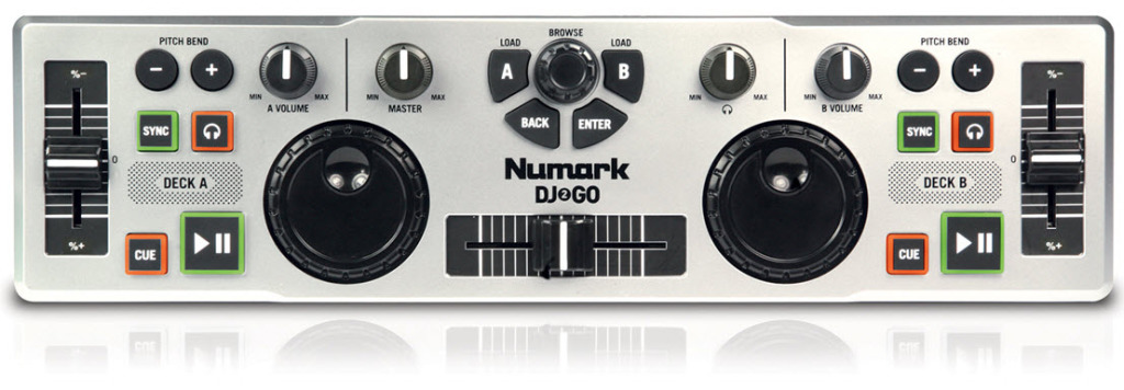 The Numark DJ2GO is a USB DJ controller for PCs and Macs that can work with any MIDI-capable DJ software (it also comes with Virtual DJ LE Lite if you need one). The panel features a layout that should be familiar to most DJs — a pair of platters, a crossfader, pitch and level controls, two deck control sections for assigning tracks (A and B), master and headphone gain controls, sync and headphone buttons, and mouse-free navigation.