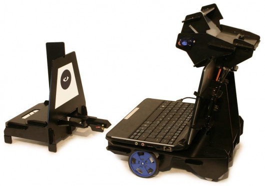 Instead of an anthropomorphic robot like most telepresence automatons, the hardware just consists of a tray with wheels. Yep, not much fun to kick around. Like the Midbot rover, you’re supposed to put a computer on the tray, which will serve as the robot’s brains, camera, A/V and wireless communication unit.