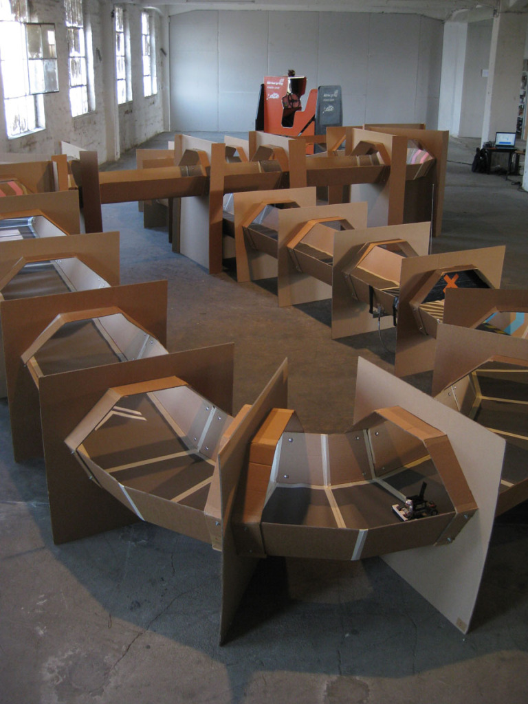 Malte Jehmlich and his comrades are behind the creation, which includes a full race track made from cardboard, a modified arcade racing cabinet and a remote control vehicle. Basically, the RC car runs around on the tracks, while the driver controls it from the cabinet. Because of the camera feeding real-time first-person footage, the driver gets to feel like they’re really driving aboard a speeding racer, while onlookers can watch a toy car actually running laps on the track.