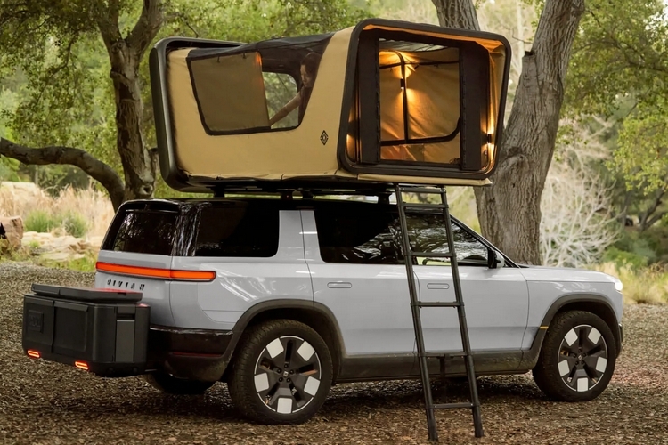 Like their first two vehicles, this SUV is designed for outdoor adventure. As such, it gets large storage out front for carrying gear, while both rows of seats can fold down flat for laying out an air mattress, making it a viable vehicle for car camping. Rivian also claims they’re developing a bespoke rooftop tent, although details for that won’t be coming out until later.