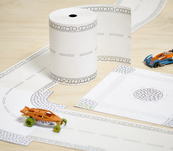 The main Road on a Roll product consists of a roll of paper that you can lay down on the ground to build an instant drag strip. Each two-lane roll can stretch up to 164 feet, allowing you to make one satisfyingly long road for drag racing die-cast rides. Want to build something more complicated than a straight track? Not a problem. They sell paper corners and roundabouts that you can add to the tracks to create more complicated layouts, like winding roads and intersections.