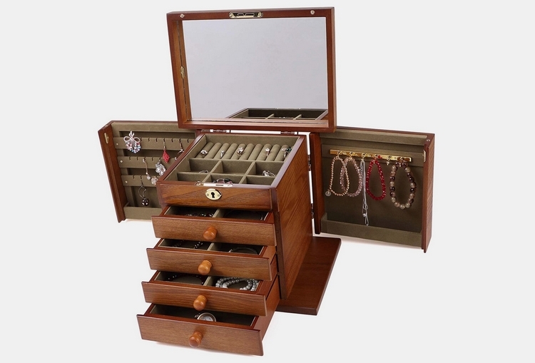 For the lady, this all-wood lockable jewelry case closes into a small box that should slot nicely in a small corner of the dresser, all while providing plenty of room to hold a small store’s worth of personal ornaments. There are four drawers with built-in dividers for large pieces; a top compartment with small dividers for rings, pins, and other smaller pieces; two side doors with hanging racks for necklaces and earrings; and even a mirror on the underside of the lid. The only downside: if she doesn’t have enough jewelry to fill all those slots, you just gave her a reason to want a whole lot more.