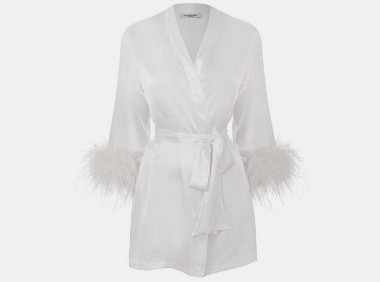 Make her feel sexy with this sensual white robe that should make anyone wearing it look like they’re reliving a romantic movie scene filled with playful caresses, soft kisses, and all of love’s little playful joys. It’s made with a silk satin blend that feels especially rich and luxurious, with ethically-sourced feathers on the cuffs giving it just a hint of seductive flare.