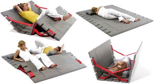 The Sasan Magic Carpet uses four separate panels that allow it to fold into a variety of angles, giving the erstwhile flat surface whole new fittings, such as a backrest, an elevated leg rest and even walls for privacy. Reshaping the mat is done through a combination of slits built into the sides and straps that you can hook onto them.