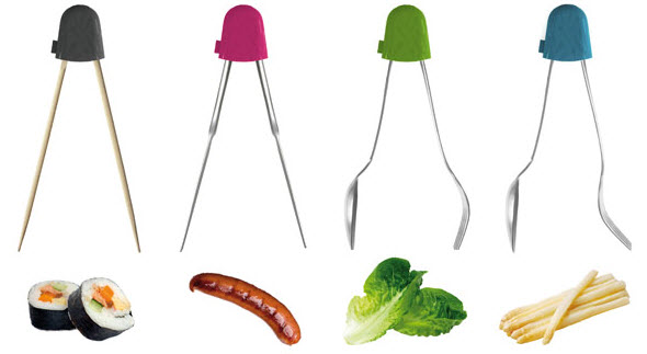 Designed by Konstantin Slawinski out of Studio Dreimann, the little widget turns practically any two pieces of utensil into hinged legs for picking up objects. That way, you can fashion yourself a pair of tongs using chopsticks, spoons, forks, knives and whatever other cutlery can fit into its narrow cross-style openings (even crazy ones like the ForkChops).