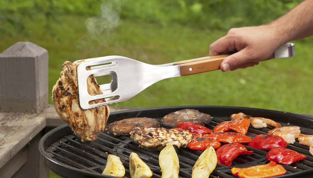 The tool has wooden handles, with all the metal parts getting a non-stick brushed finish. It measures 22.5 inches long when the fork is slid all the way out, with the spatula measuring 3.5 inches in width.  We’re not sure how easy this is to clean since there are plenty of moving parts, but if you hate having to constantly juggle the fork, tongs and spatula during outdoor barbecues, we can’t imagine anything better.
