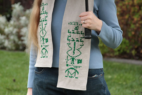 A 14 x 76 inch piece of linen was turned into the resulting edge-stitched scarf, which was sewn together on the back and at the ends, then turned inside out.  The embroidered pixels measured 3.5 x 11.5 inches and were implemented as satin-stitched columns in a single color, to more tightly reflect the SETI original.