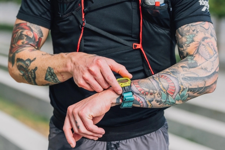 The display is housed in a hexagonal case measuring 39mm that’s clad in black resin with a neon yellow bezel that’s screwed down on four corners. Large red buttons on four sides give you access to the functions labeled across each on the bezel, with a large black button below the screen serving as the main control for the watch. We’ll be honest, we’ve seen plenty of Ironman models in our time and this just might be one of the nicest-looking ones we’ve seen. Heck, it might be the nicest one ever.