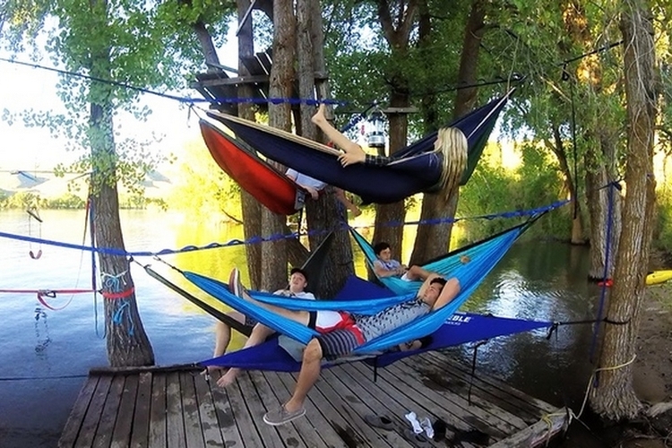 Made by Treble Hammocks, it’s a webbing frame that’s designed to strap around trees, with multiple loops throughout its length for mounting up to three hammocks comfortably. The hammocks are mounted in a triangle configuration, too, making it easy to socialize with the folks swinging on the two adjacent hanging beds.