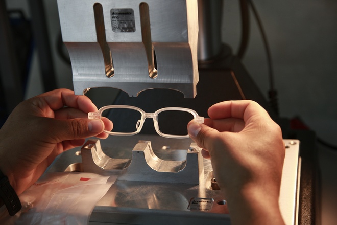 Each pair of TruFocals eyeglasses feature a two-lens design – one flexible and one firm.  The flexible one uses a transparent expandable membrane that’s attached to a rigid surface and is set closer to the eyes,  while the firm one stands in front of it, with a pocket between them.  A small amount of clear fluid sits in the divide, which alters the shape of the inner lens when you push the slider control installed on the bridge.