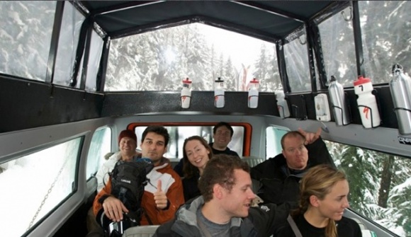 Up to 16 passengers can be seated inside the vehicle, along with their winter haul and skiing gear in the back. Since vans can get claustrophobic with 16 bodies on board, they blew the big steel roof and replaced it with a full panorama canopy. Granted, the change should make it a bit colder inside, but it sounds like a fair trade for a larger headroom and an awesome view.