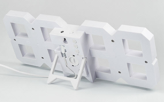The unit can either be wall-mounted or set down on a desk, although you’ll need to plug it to a wall-outlet to get it to work (yeah, you can’t wear it around your neck — sorry, Flava Flav). A built-in light sensor changes the brightness of the LEDs depending on in-room lighting, so it dims down considerably when you turn off the lights. The clock has both time and alarm modes, but no date display.
