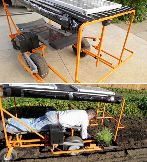 Made by Australian inventors Brendan Corry and Peter Sargent, the motorized cart is designed to carry one operator on his stomach in a prone position. That way, you get full access to working with the soil without having to bend your legs and arch your back.