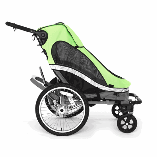 In bike mode, the Zigo X2 is a two-wheeled, adult-sized bicycle that manages multiple speeds and sports 20-inch wheels.  To arrange seating for your kids, you’ll need to remove the bike’s front wheel and connect it to the ChildPod, a kiddie stroller with casters in front and the same 20-inch wheels in the rear.  A third component, the optional Jogger Kit, can be appended to transform the baby transport into an exercise stroller, in case you want to take your kid out while doing your morning brisk walk.